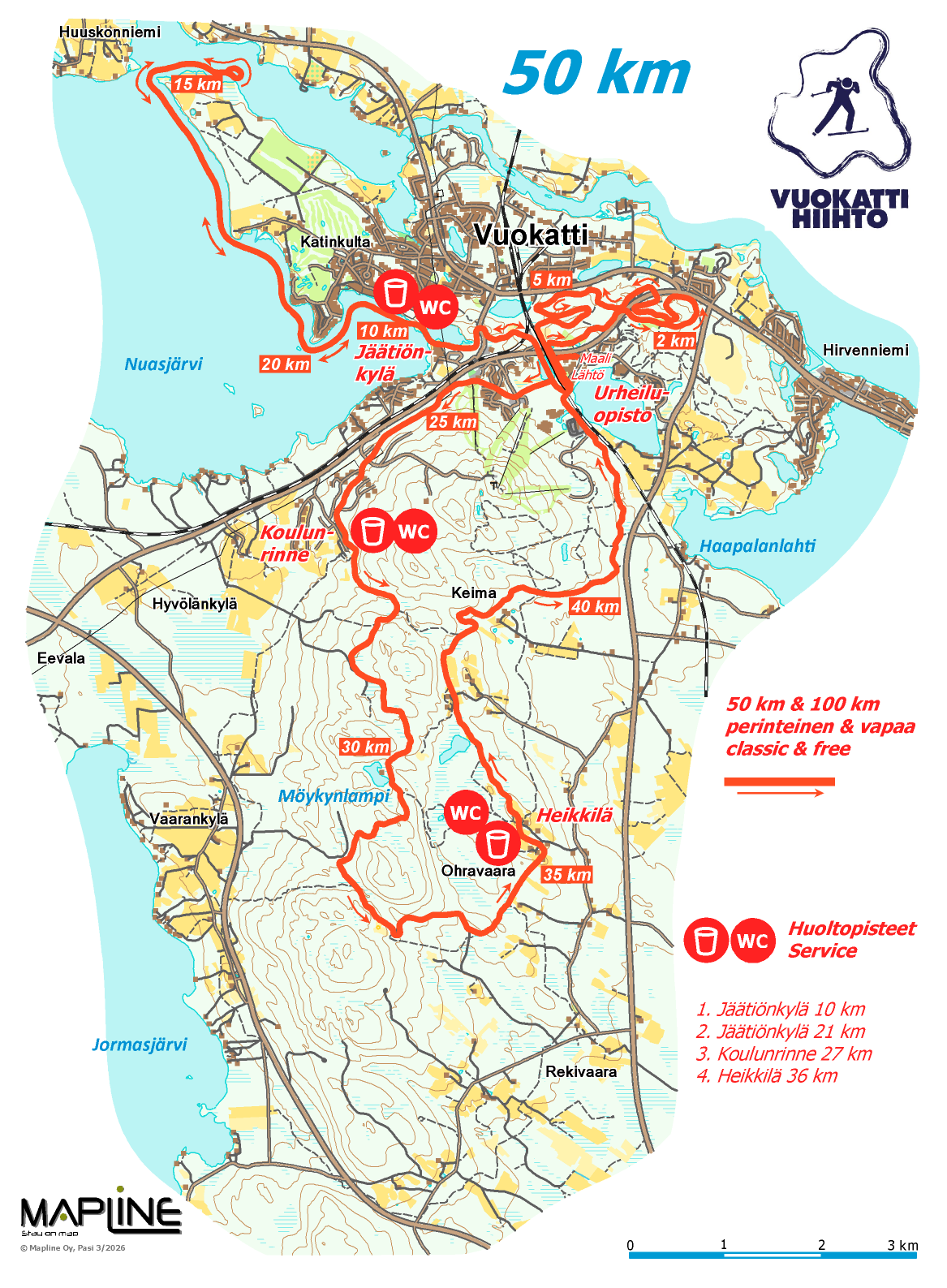 50 km service points(The 50 km skiers visit the 1st and 3rd service points twice. The 100 km skiers will visit the 2nd service point twice and the 1st and 3rd service points four time):